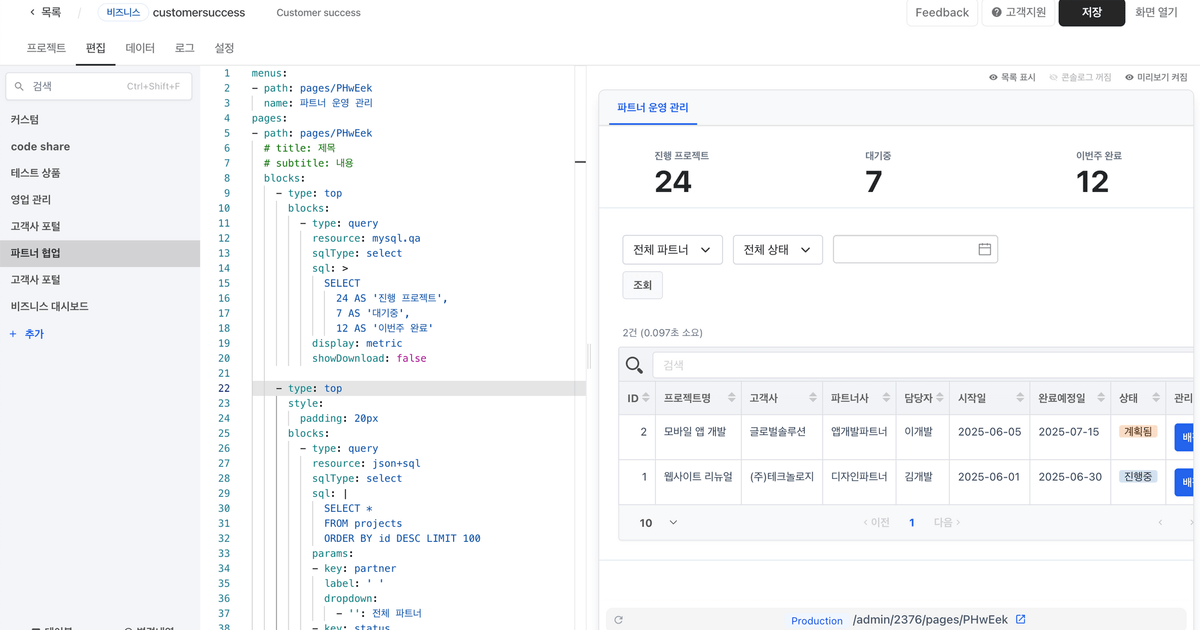 페이지, 테이블, 필터, 액션 같은 것을 YAML로 적고, 실제 데이터 처리는 기존 API나 DB가 담당하는 구조입니다.
