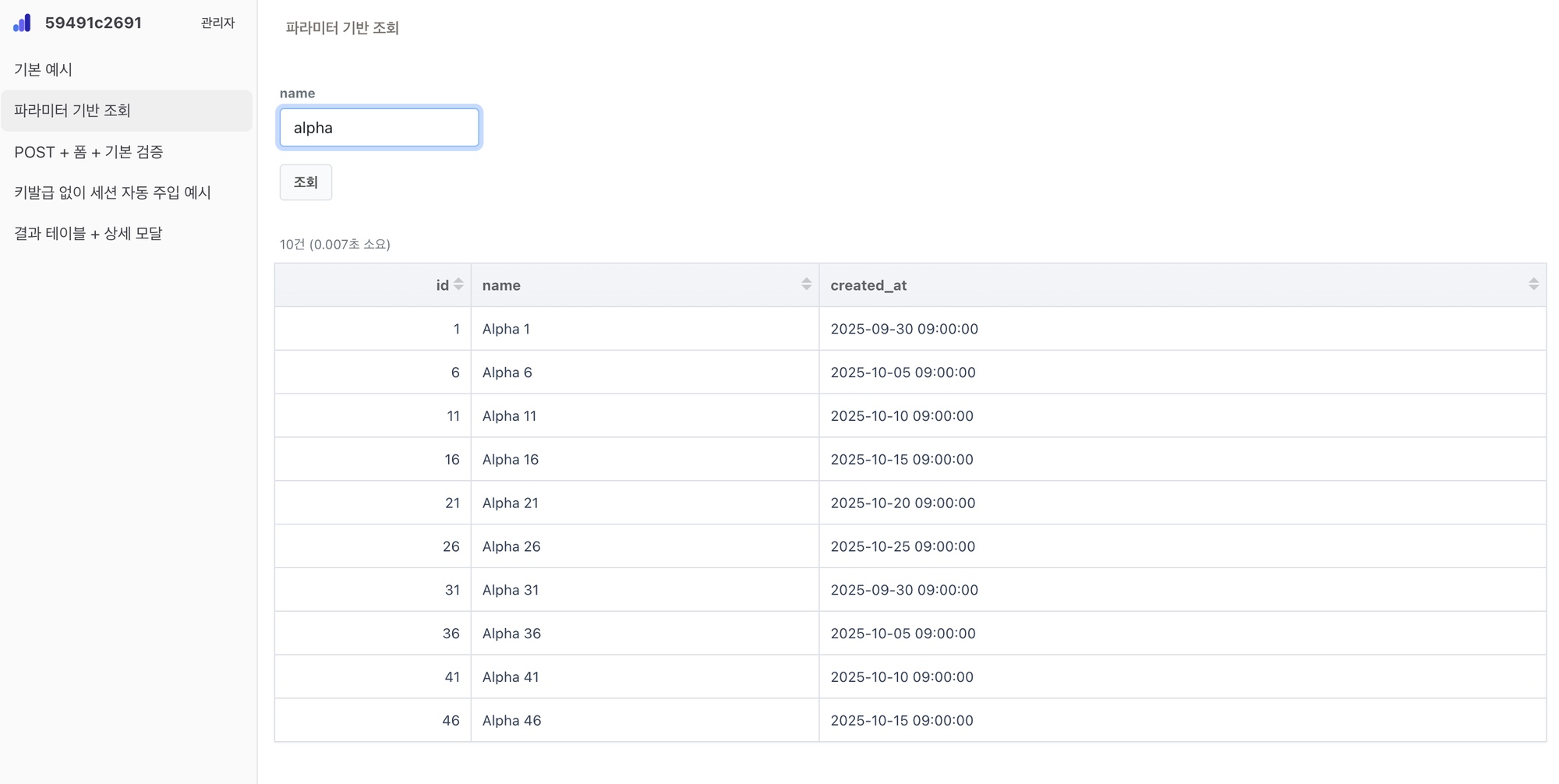 { id: 1, name: 'Alpha', created_at: '2025-10-01' },