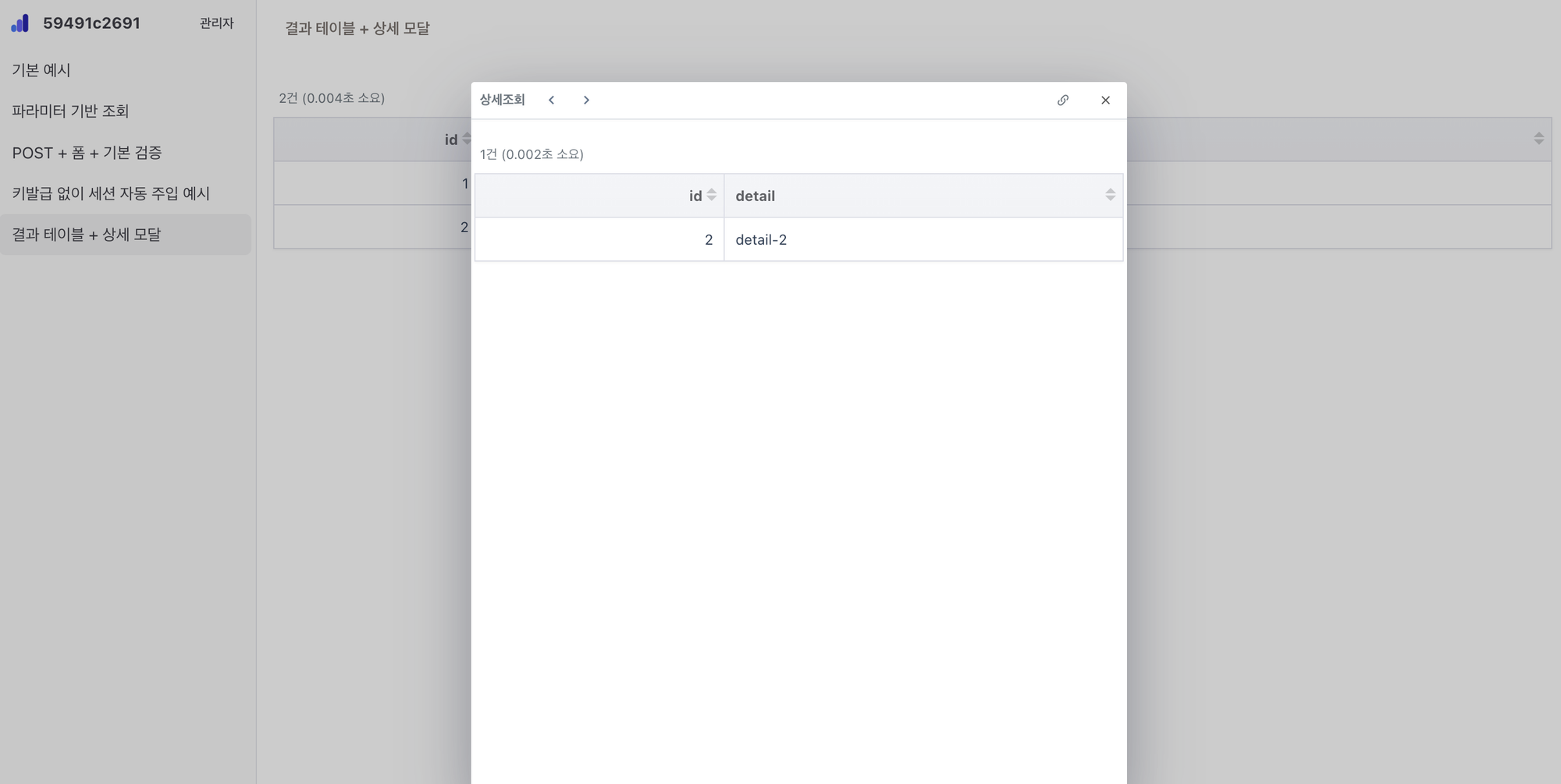 결과 테이블 + 상세 모달 — 테스트 화면이 곧 운영 화면