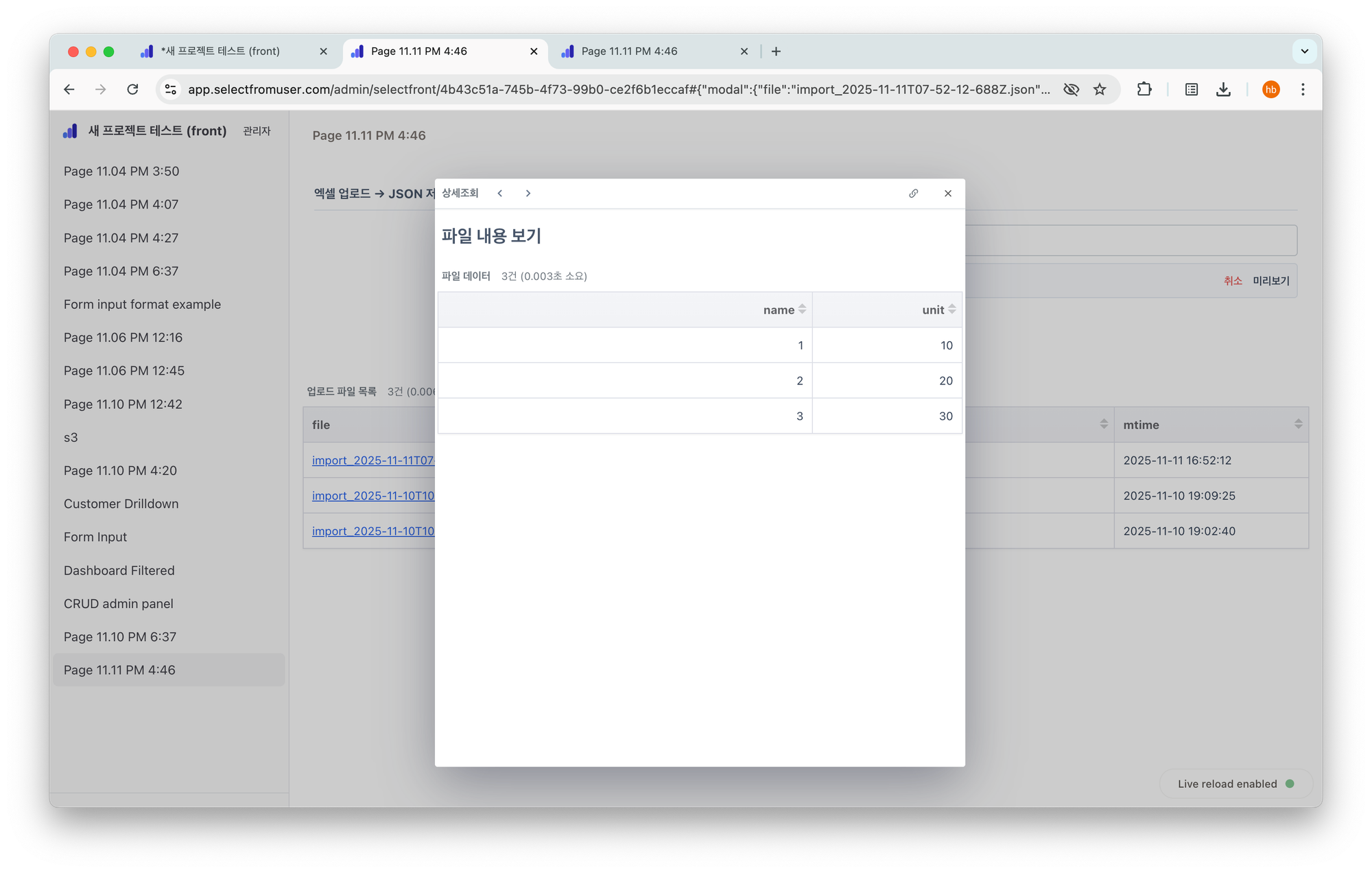 - 파일명을 클릭하면 상세 데이터를 모달로 미리보기